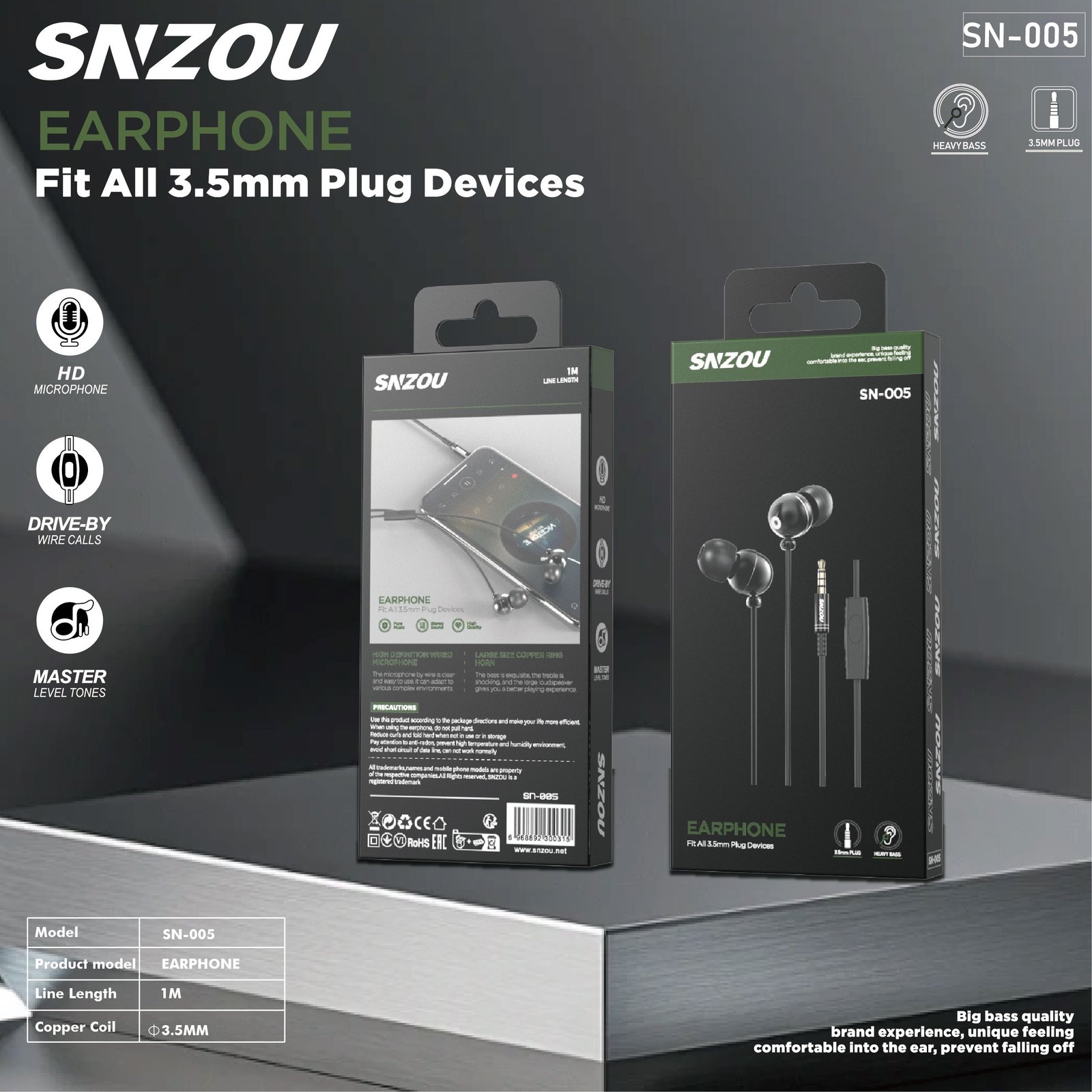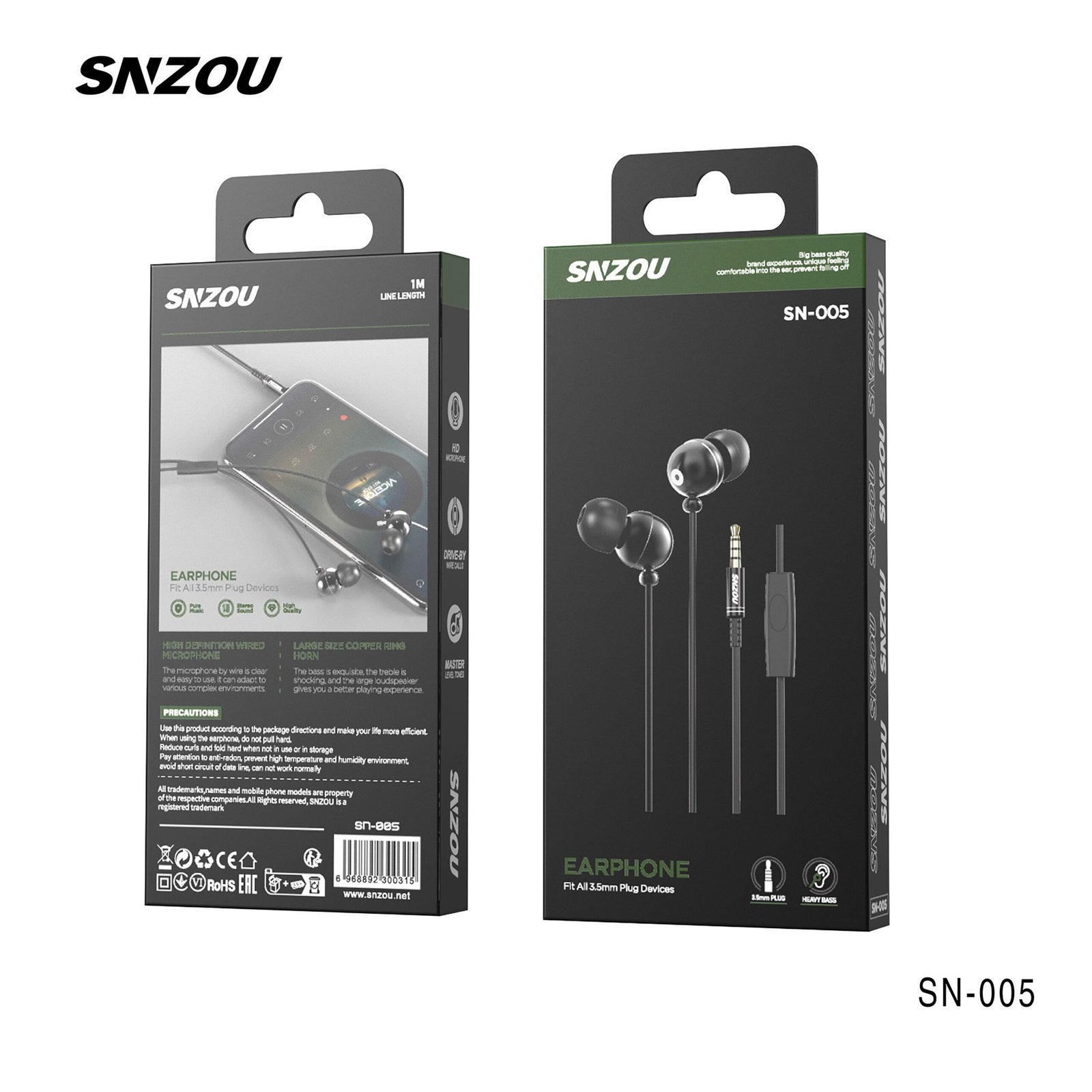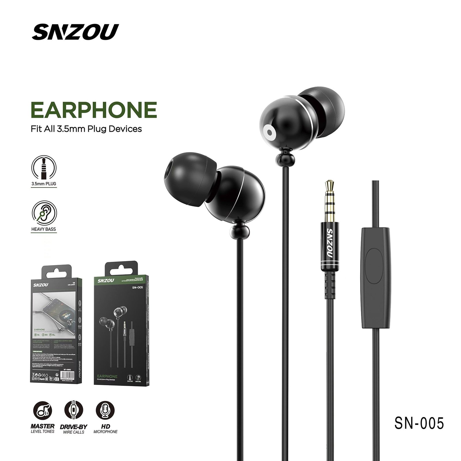 The SN-005 Earphones provide deep bass and high-definition sound quality through a 3.5mm jack connection. With a built-in microphone and noise isolation, they ensure clear communication and an immersive music experience with an ergonomic fit.