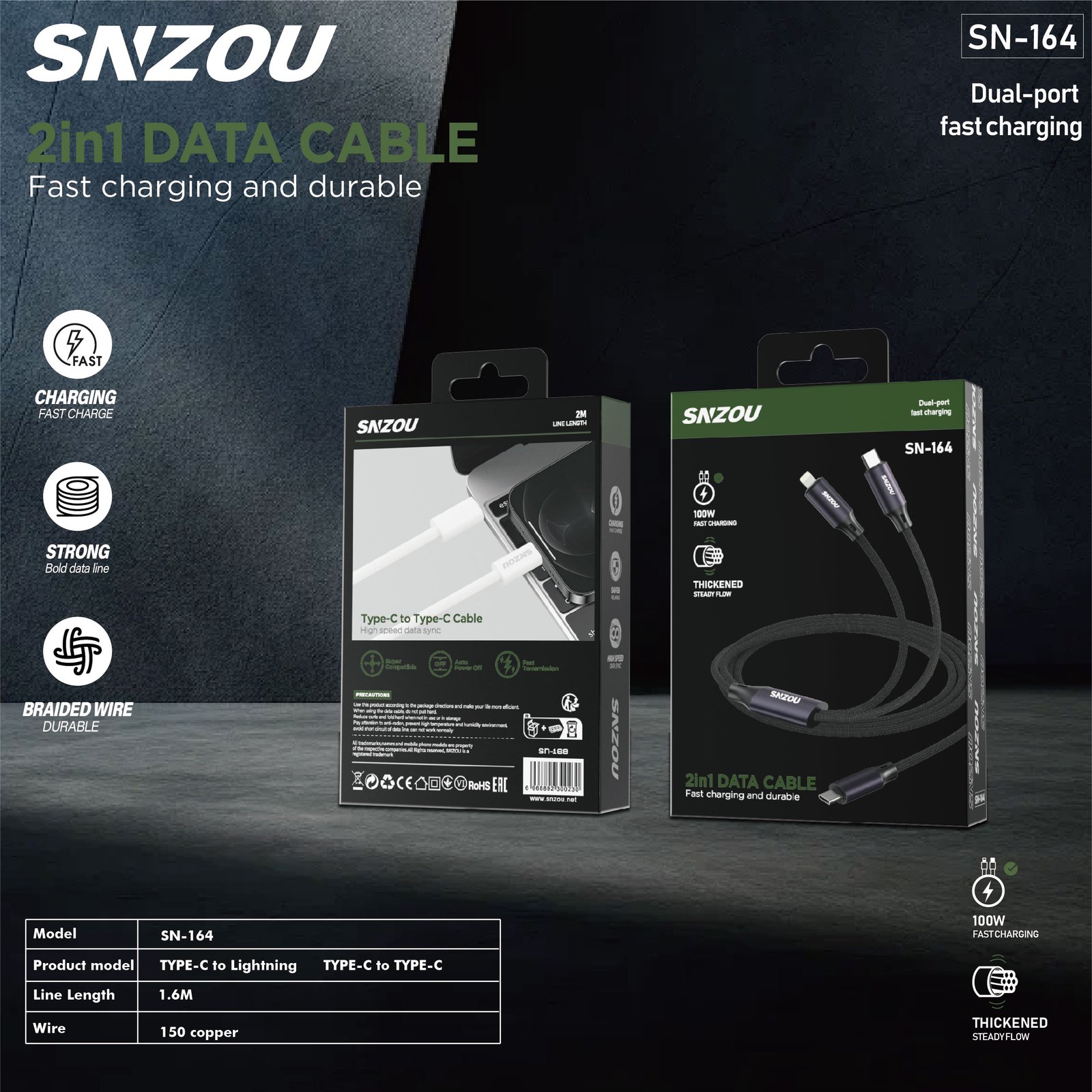 The SN-164 Data Cable features a 2-in-1 dual-port design for simultaneous charging. With Thickened Wire Core Supporting 100W fast charging, it provides an efficient and reliable power supply for multiple devices.