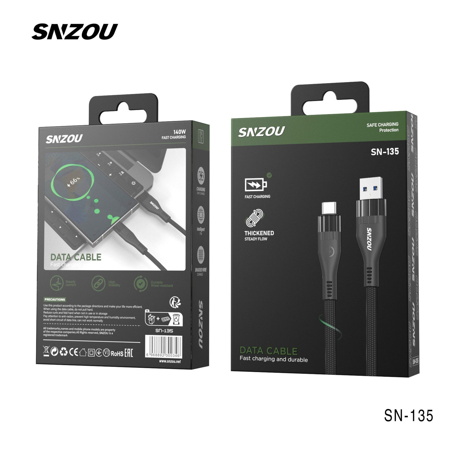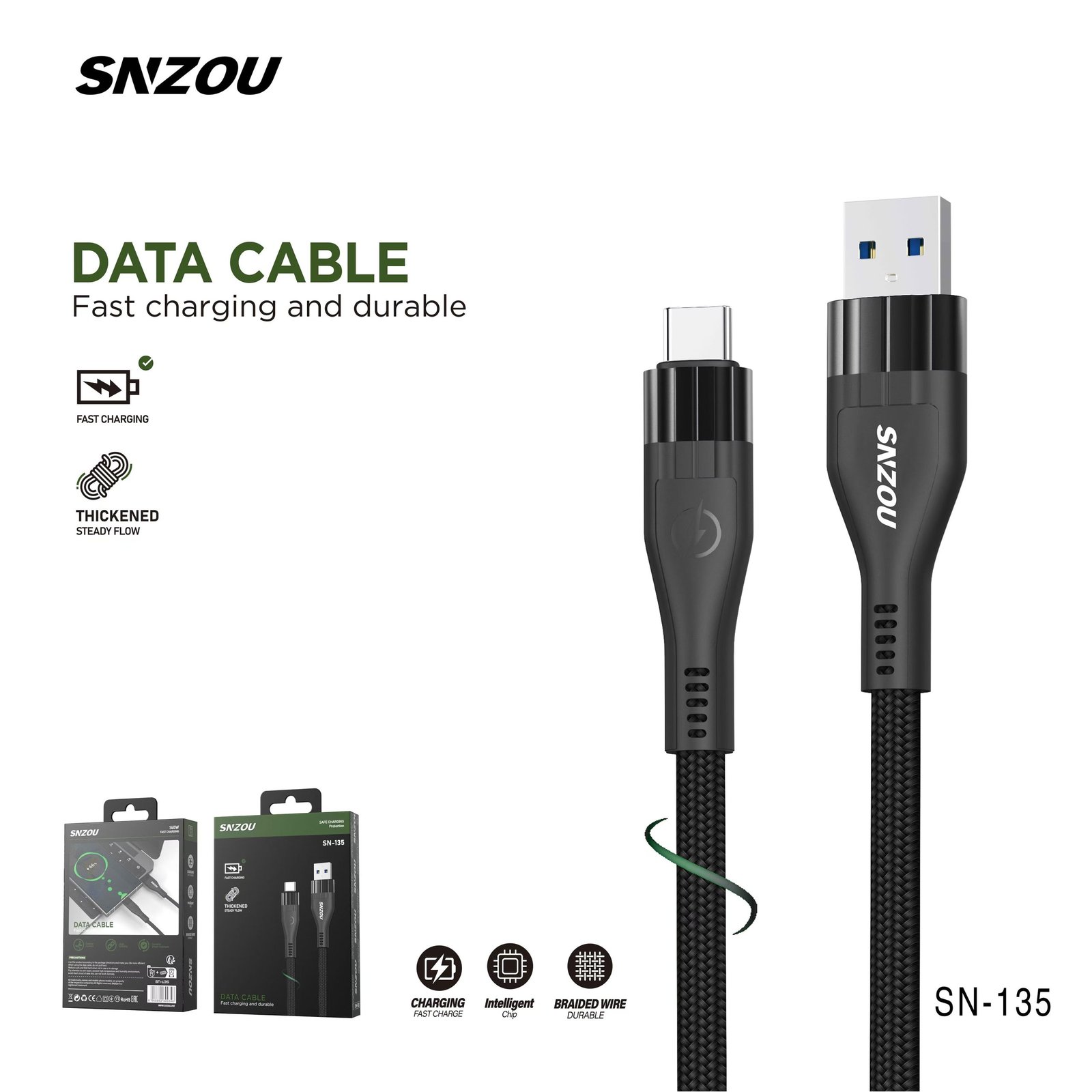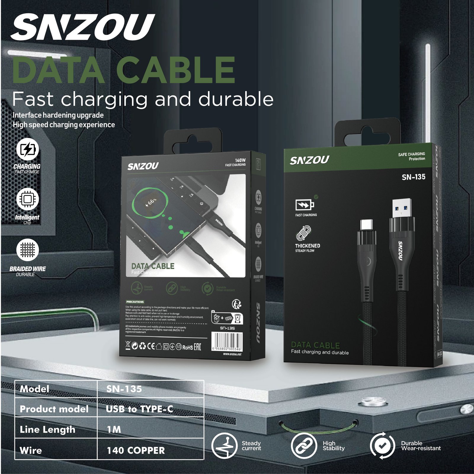 The SN-135 Data Cable is designed for high-speed charging with 140W power output. Featuring a thickened wire core and reinforced design, it ensures a steady and efficient power flow for all Type-C compatible devices.