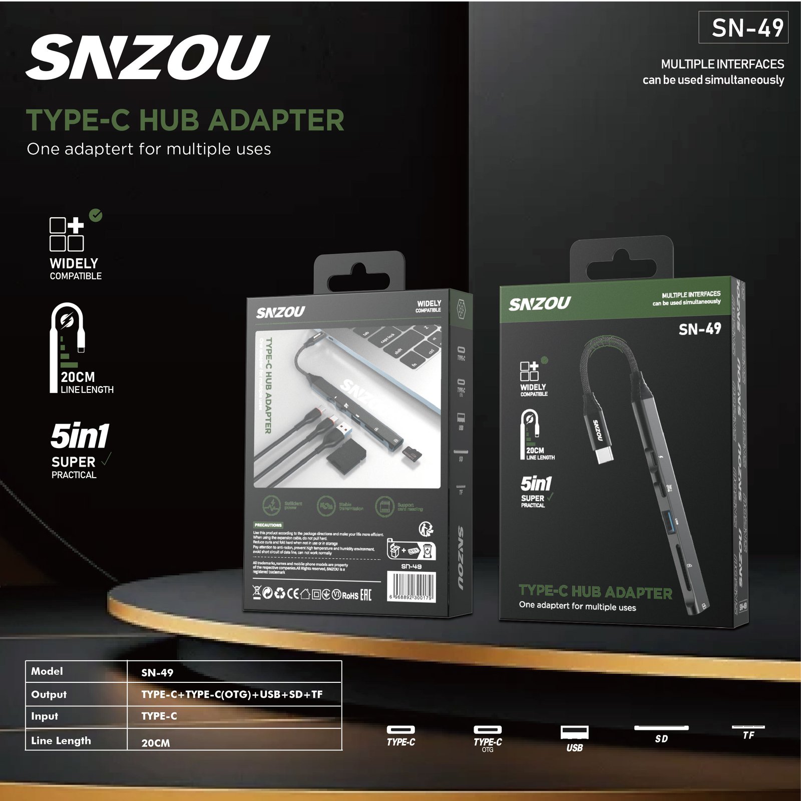 The SN-49 Type-C Hub Adapter Expands Connectivity with a 5-in-1 Multifunctional Design, supporting USB, SD, TF, HDMI, and Power Delivery. Its compact size and durable build make it perfect for professionals needing reliable device expansion.