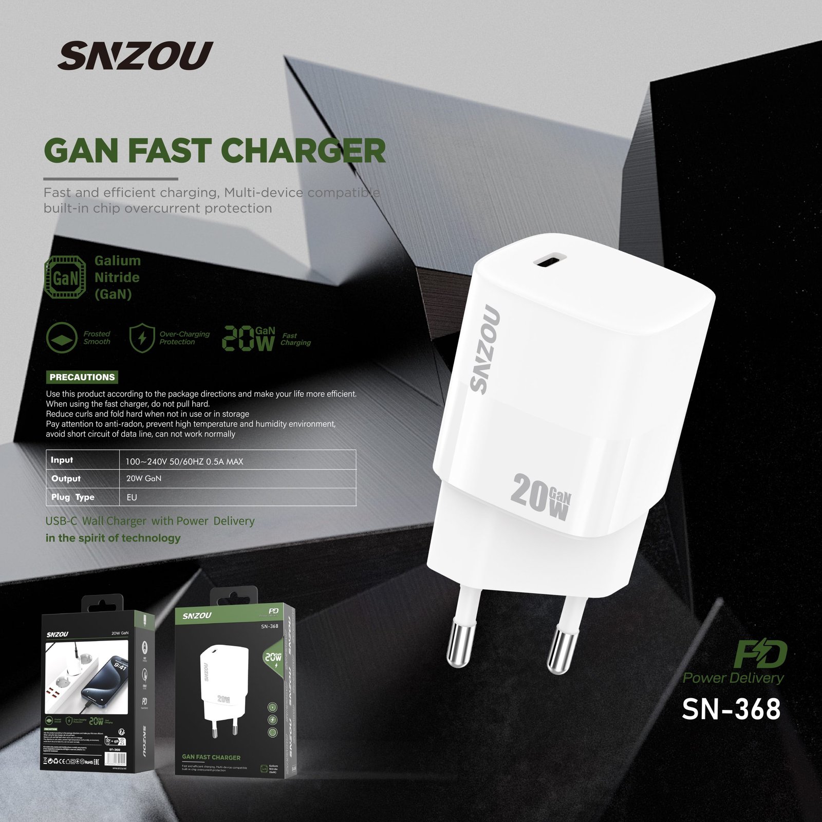 20W GaN charger for efficient fast charging of mobile devices. Short circuit protection.