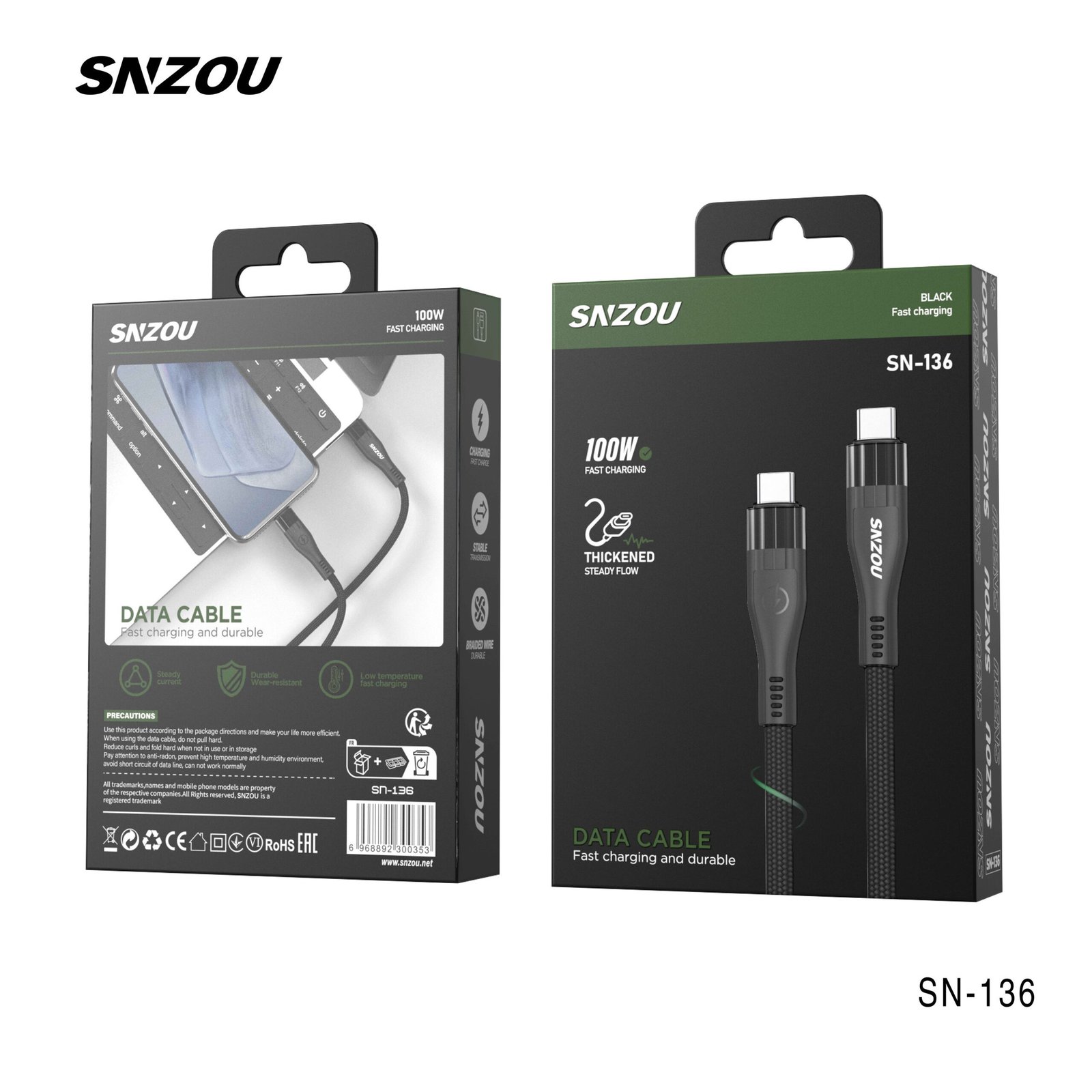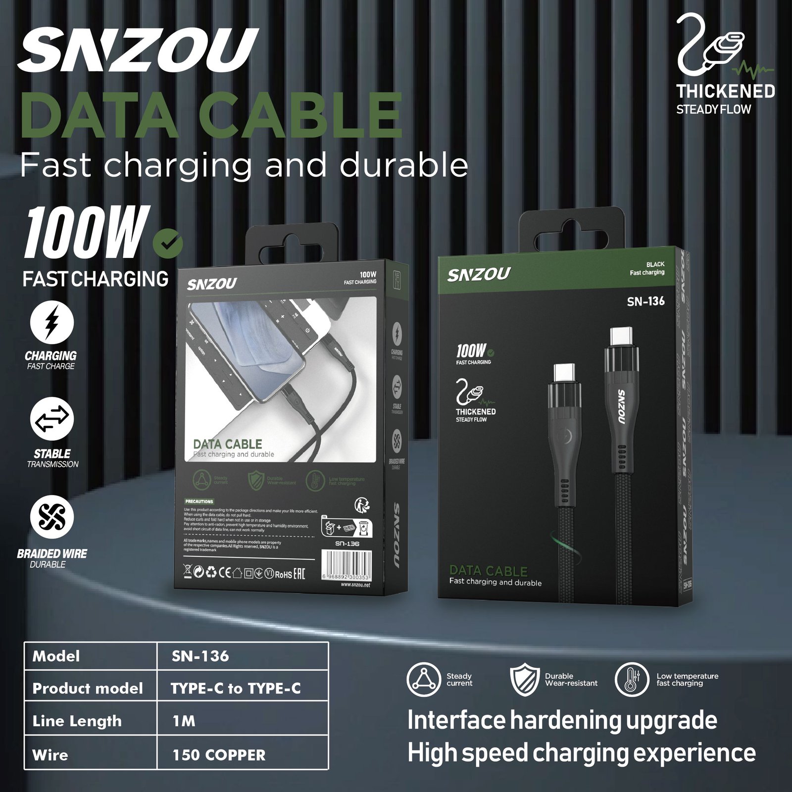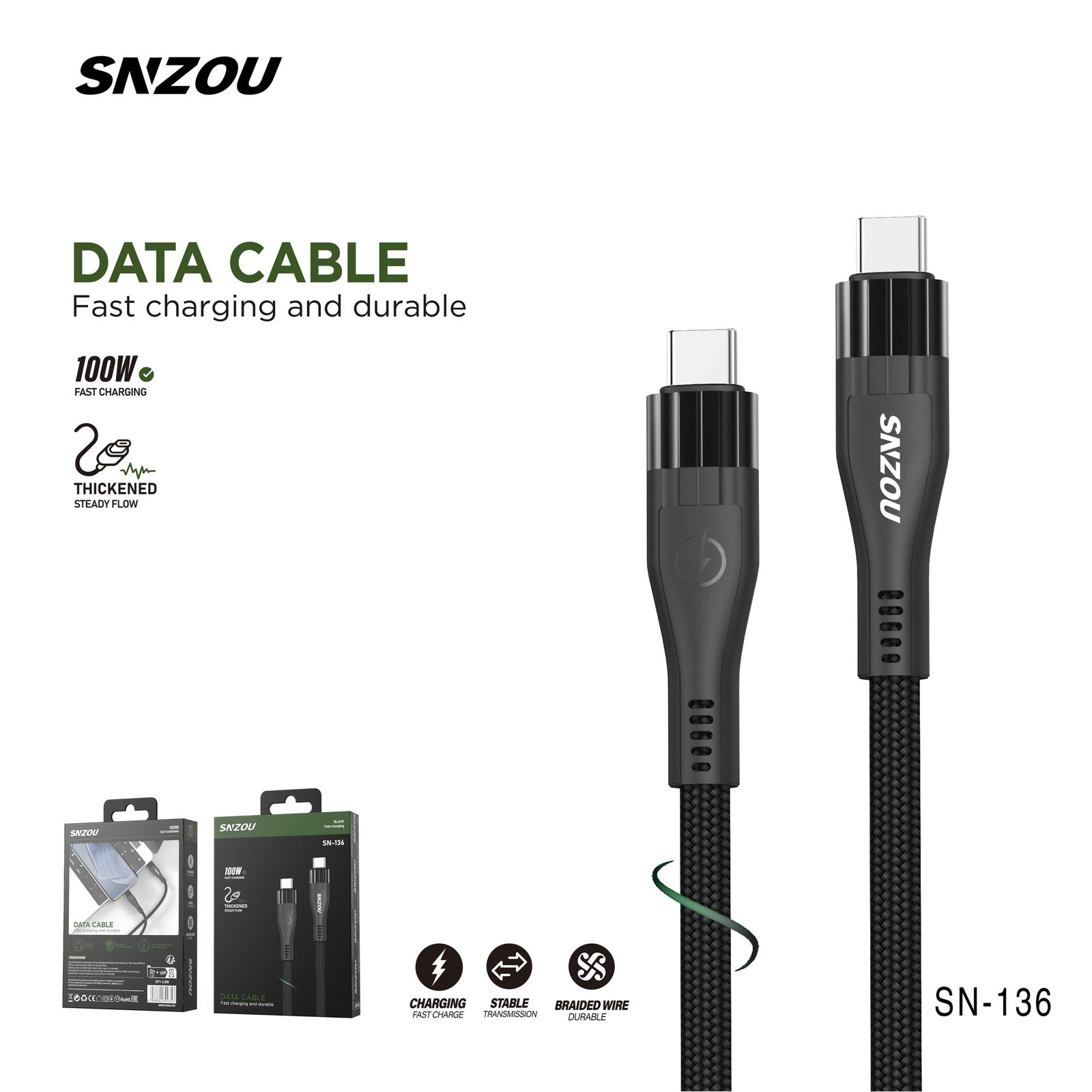 The SN-136 Data Cable is a high-performance charging cable with Thickened Wire Core supporting up to 100W fast charging. With a reinforced wire core, it ensures a steady and reliable power flow for all Type-C devices.