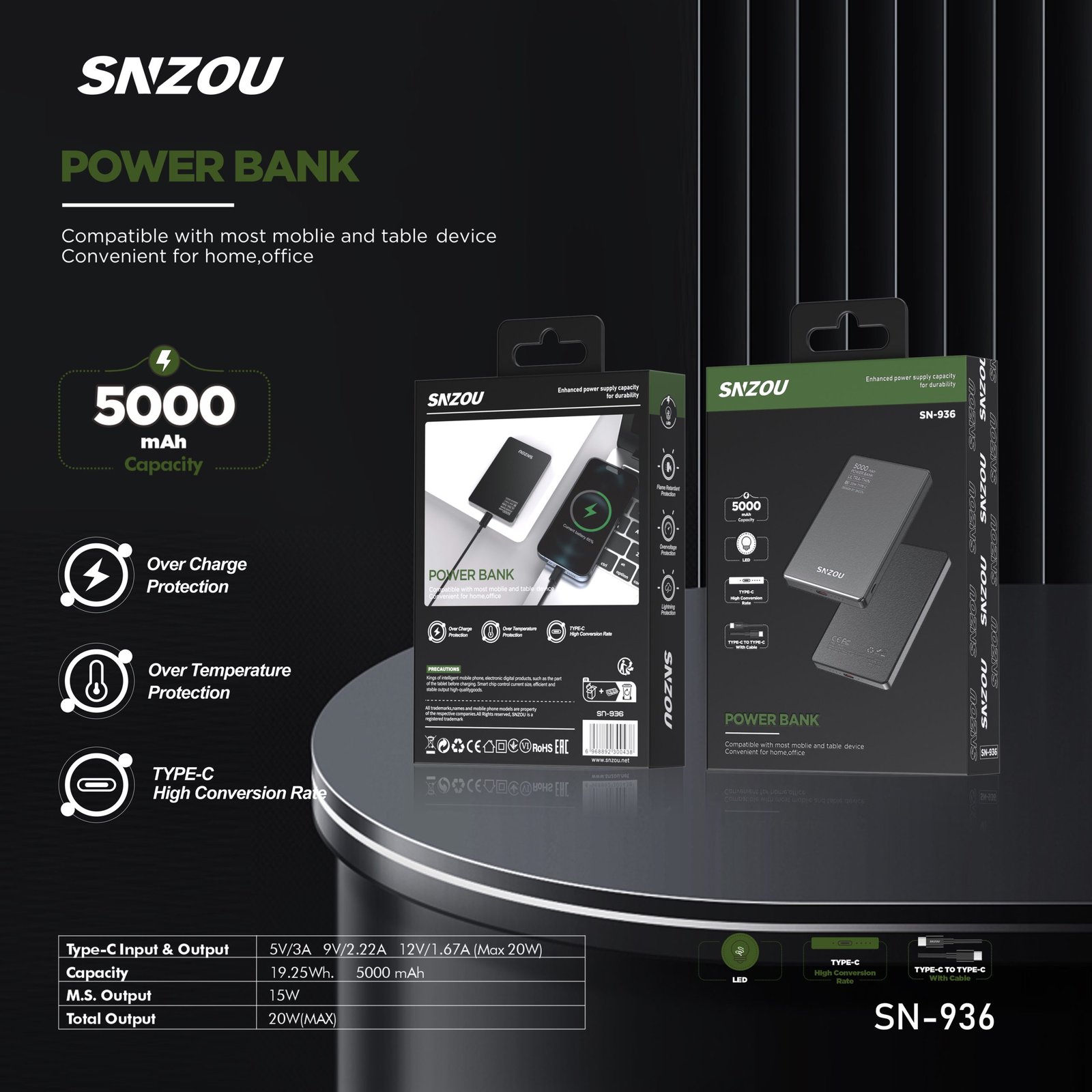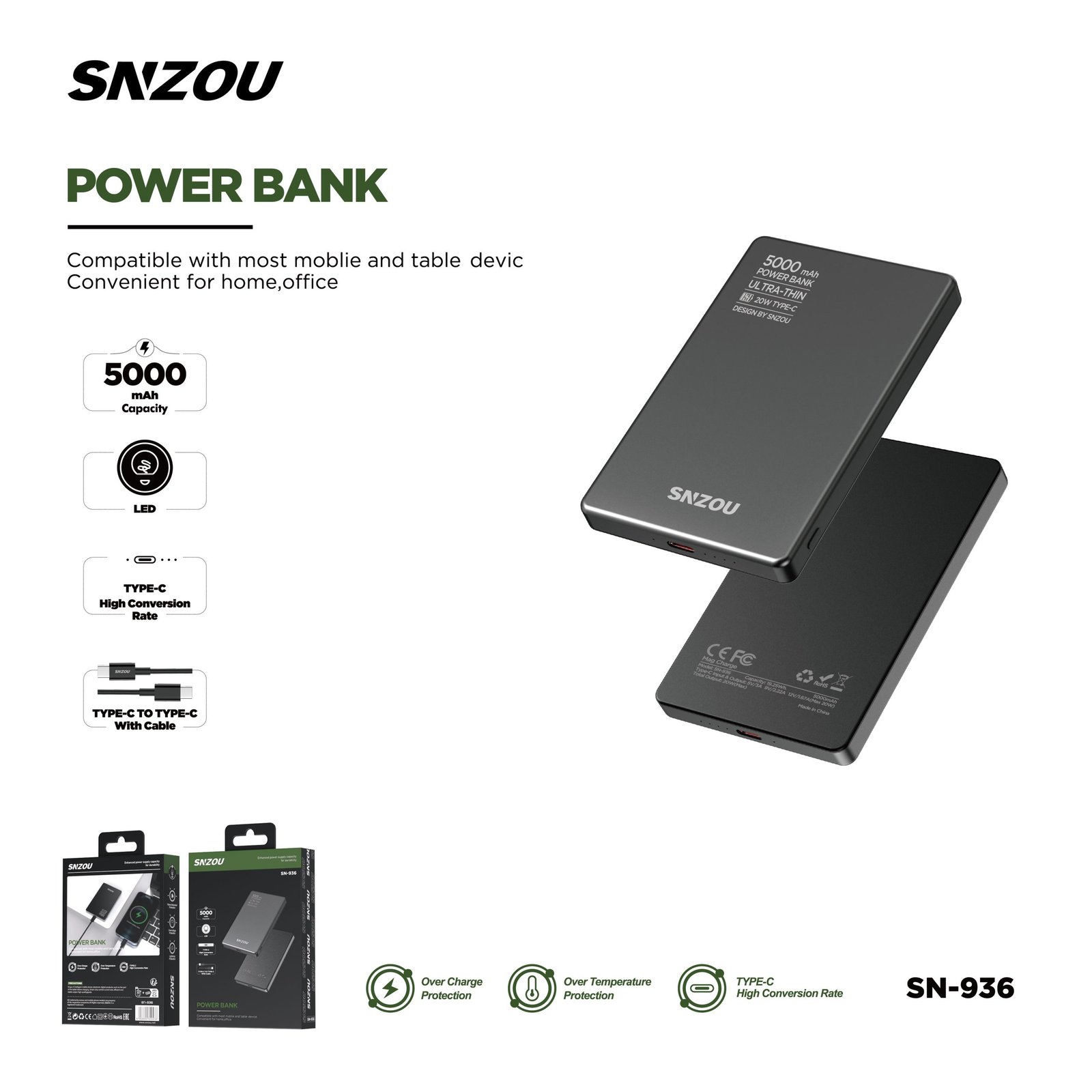 5000mAh power bank with lightweight and portable design. Slim design, Overcharge protection.