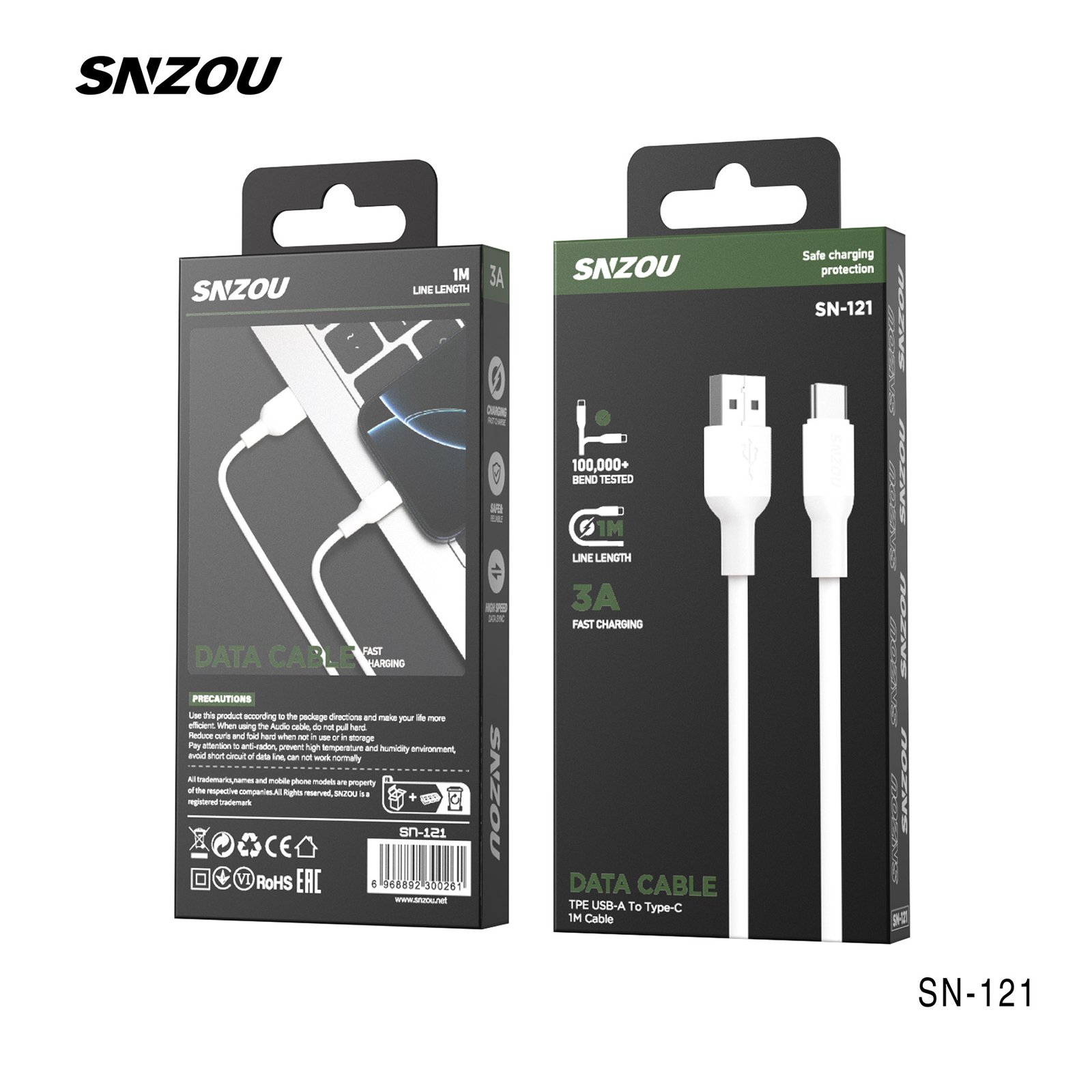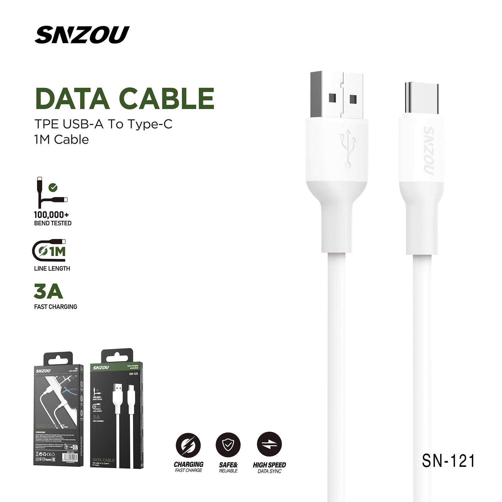 The SN-121 Data Cable is a high-speed charging and data transfer cable with a USB-A to Type-C connector. Designed for durability, it has undergone 100,000+ bend tests and supports 3A fast charging. It ensures safe charging protection and seamless connectivity with all Type-C enabled devices.