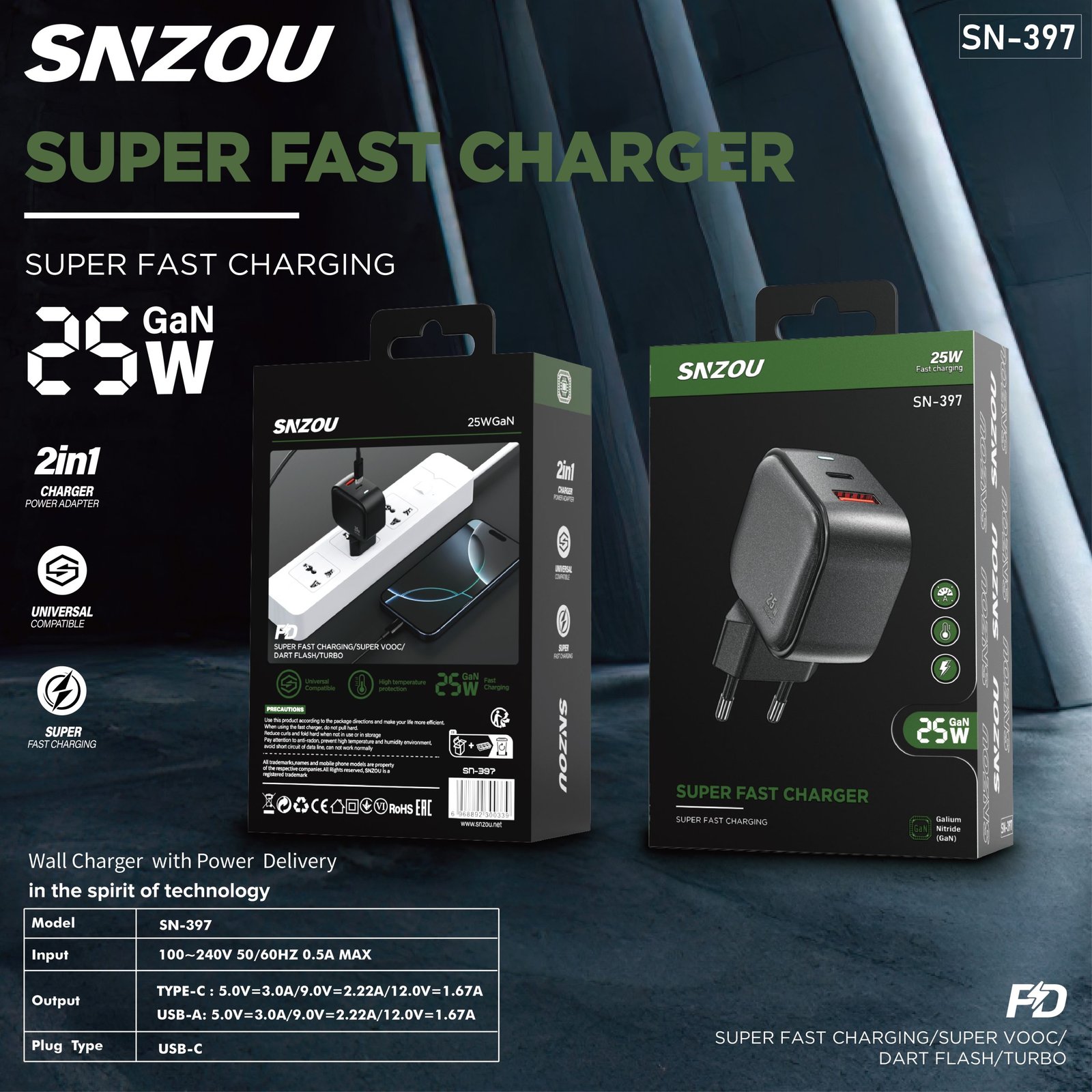 25W charger with dual ports and universal compatibility. Compact design, GaN technology.
